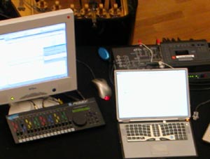 For this project though, Reinhold Friedl invited me to control the spatialization myself in a live performance, for which I expanded upon some of my older programs. The technical setup is built around two laptops running pd controlled by a faderbox and a touch-sensitive gesture-control keyboard.